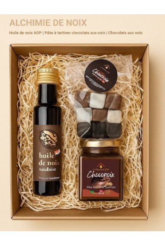 Ce cadeau "100% à la Noix" est composé de la délicieuse huile de noix toastée certifié AOP, de la pâte à tartiner au Noix et des chocolats avec noix toastées et pépites de noix croquantes.