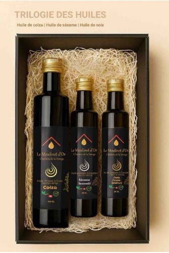 Ce cadeau est composé des trois délicieuses huiles avec l'huile de noix toastée, l'huile de Colza bio Holl, l'huile de Sésame avec ses parfums exotiques.